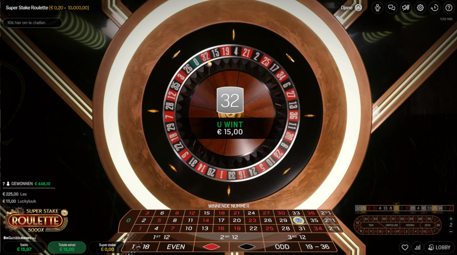 Super Stake Roulette 5.000x biedt een opwindende speelervaring in het live casino, je hebt de keuze om traditioneel roulette te spelen of Super Stake, dit kan je eenvoudig doen door de Super Stake knop aan te drukken naast de inzetten.